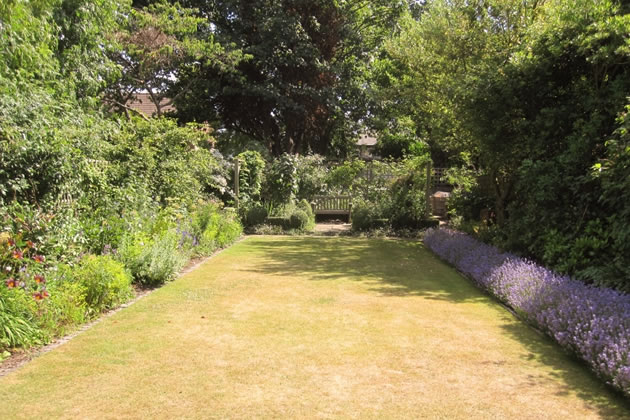 The garden is divided into two distinct areas: the original, surprisingly secluded garden and a newer section developed in 2019. The older part features a large lawn bordered by a 50-foot herbaceous border filled with climbing roses and clematis, alongside a lavender hedge and spring border. A raised and paved area at the far end includes box topiary and a rose arbour, with compost heaps and additional planting beds tucked behind. The soil, noted for its light and dry qualities, supports a growing collection of salvias and other unusual herbaceous perennials, many of which are propagated from seed or cuttings by the owner.