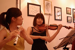 Local art lovers, artists and their friends and family took the opportunity to view and discuss the works on display, and enjoy the live music provided by violinist Asuka Tsujimoto & flautist Kana Takahashi (pictured below, all photos courtesy of Rachel Pepper).