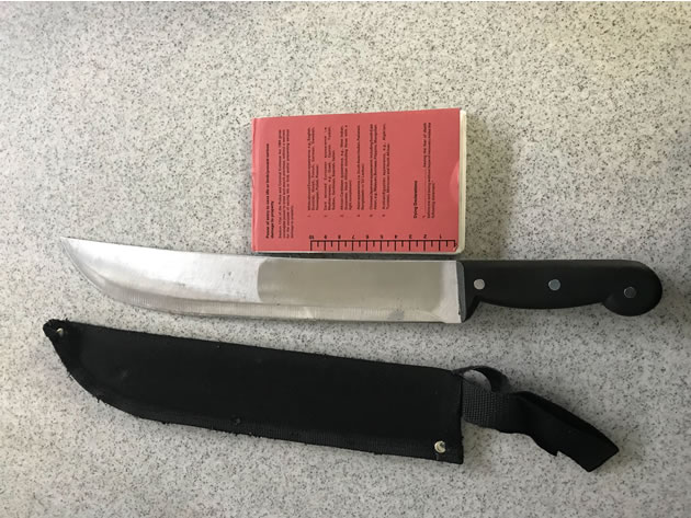 Knife with 10 inch blade and drugs found in rucksack after arrest