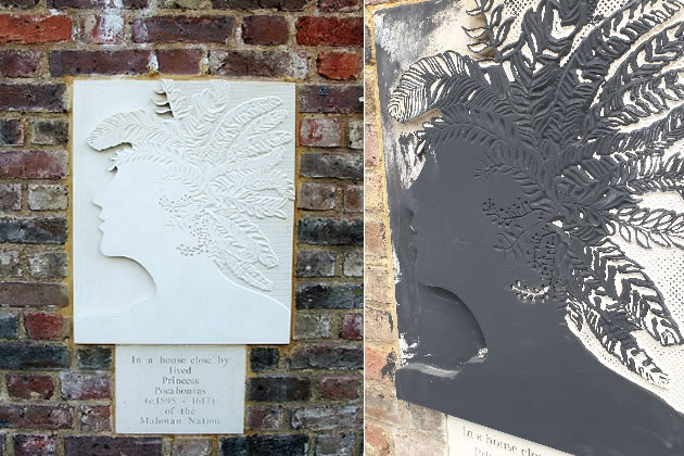The black paint covers the head and head-dress of Pocahontas as well as the arch of flying feathers that rise up from the plaque that was originally designed by local ceramicist Claire Ireland.