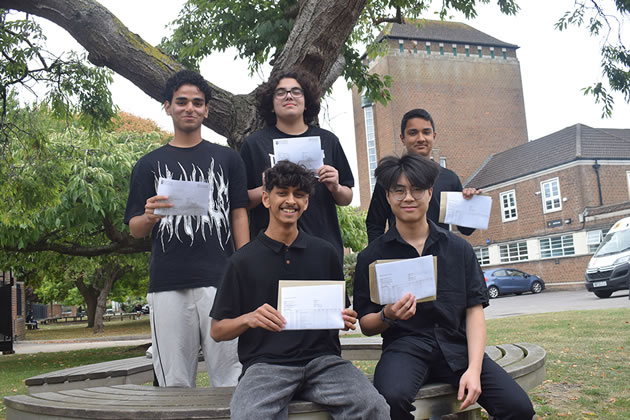 The performing arts continue to be a prominent feature of the school’s offer. Three students have secured places at the Purcell School, a specialist music institution, with Ayman Shah among them. Shah, a clarinettist and founding member of a student band, also led the school’s Maths Challenge Club. His bandmate Ashish Kurian also received strong results. Drama remains a popular and successful subject, with 74% of students achieving grades between 9 and 4. David Ali, Axle Moldero and Vanshpreet Singh have all featured in recent school productions and achieved a combined total of 25 grades at 9–7.