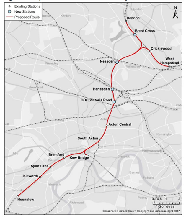 The line would run between Hounslow and Cricklewood and would not require new track to be laid. It would link existing lines on the Hounslow Loop and the North London Line. The proposed service would be part of the London Overground network and would provide a direct link with Brent Cross from stations such as Kew Bridge and Brentford. A new station is also proposed which would serve the stadium being built at Lionel Road. The total cost of the scheme is estimated to be around £600 million.