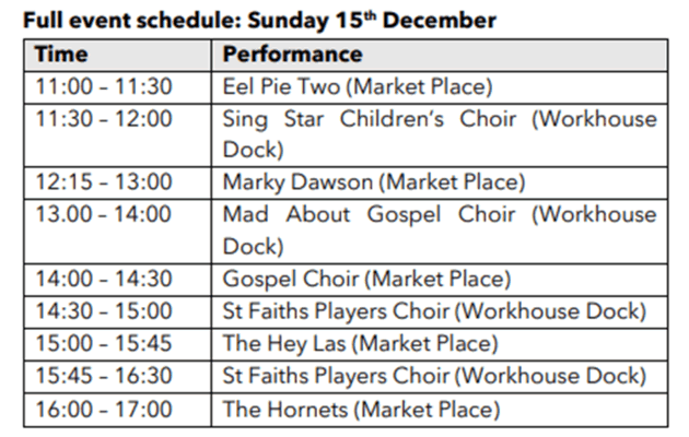 The seasonal celebration will take place in Market Place, Bradshaw Yard and Workhouse Dock from 11am to – 5pm on Sunday 15 December.