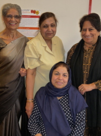 Pictured: Gulshan Iqbal (seated) with colleagues who translated the text into the various languages, (l-r) Beant Sachar, Kamaljit Bedi and Aruna Shah.