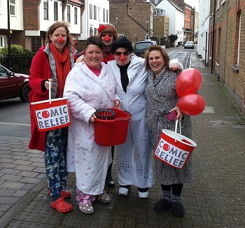 On Red Nose day Councillors Ruth Cadbury and Sue Sampson raised £406 for Comic Relief at a rush hour road "toll"  in Isleworth.  In their slippers and dressing gowns the two Councillors collected funds from drivers slowing down at the width restriction in Church Street. They were joined by Elvis, and local residents including Katherine Dunne.