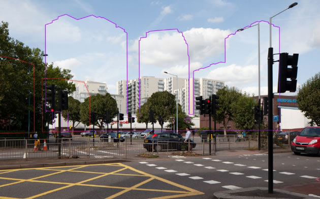 Views of development (purple) from Surrey bank of the Thames