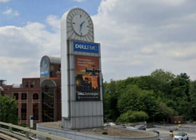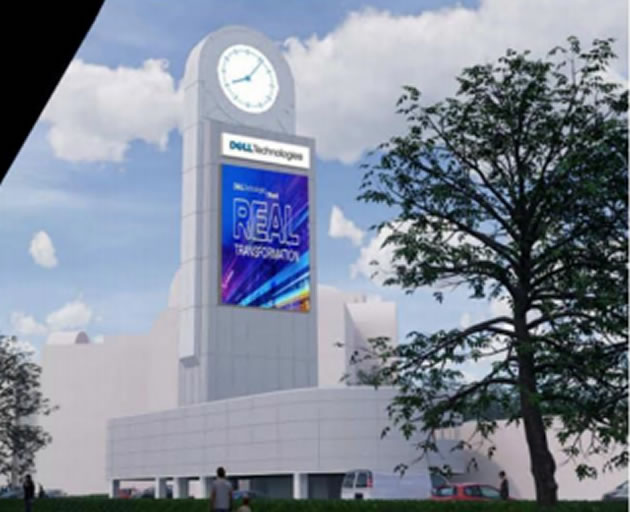The Dell EMC Clock Tower, a purpose built advertising structure by the eastbound carriageway. There has been a clock tower at the site since the 1930s and advertising has been displayed on it since 1965. The current one was built in 1989 but now the technology giant is arguing that it appears tired and dated.