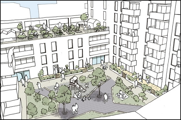 The developer, Ecoworld, is now proposing a development of 149 flats and houses, with 67 car parking spaces, and a central park of 1,770 m2 which will be fully accessible to the wider community. There would be 108 flats ranging from 1-bed to 3-bed homes and 41 houses ranging from 2-bed to 5-bed homes. Two central blocks of flats would extend to 6 storeys. The provision of affordable housing has yet to be agreed.