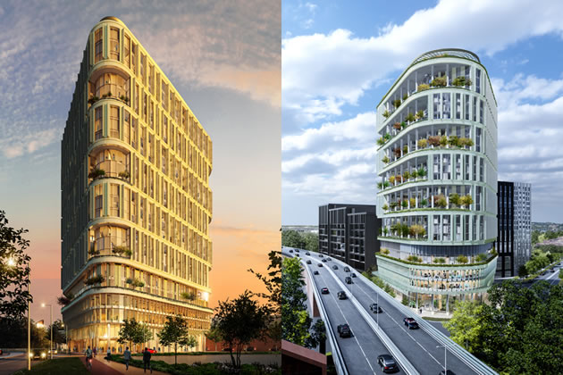 Visualisations for development on the current Tesco site (left) and the Homebase site (right)