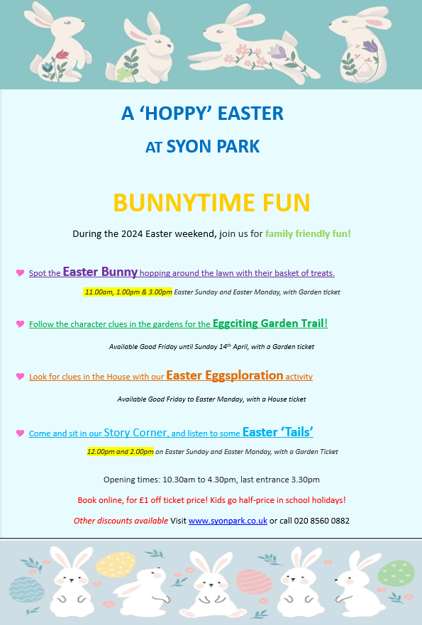 Spot the Easter Bunny hopping around the lawn with their basket of treats. (11.00am, 1.00pm, 3.00pm on Easter Sunday and Easter Monday, with Garden ticket)