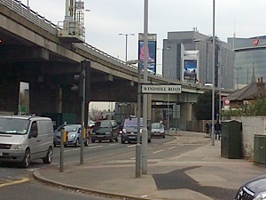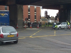 The area - underneath the M4 flyover - features a small yellow box junction, traffic lights and a number of pedestrian crossings.