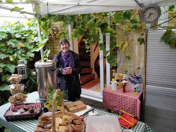 Afterwards I am directed to have a Macmillan Coffee afternoon in Jo’s garden in Brook Road South. Tea, a double hot dog, and a small bag of fudge like mother used to make it and a pleasant interlude all round in Jo’s extremely quirky and extraordinarily Brentfordish garden. She is offering to hire it out for socially distanced outdoor events. To be honest, the Joy of Six should not be troubled because you couldn’t fit more than 6 in, with social distancing.