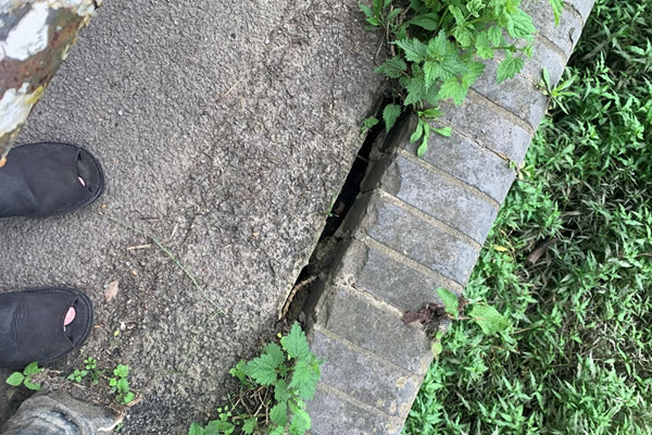 On Monday, down to Strand-on-the Green to take a look at the footway there and in particular at a place where the river wall has slightly parted company with the footpath. I’m assured that the feet seen in this picture are attached to a real living human being, not leftovers from a feast f rom the Loch Chiswick Monster, or Piggy, as he is affectionately known, after the town. We’re accompanied by local councillor Gabriella Giles, who told me the correct pronunciation of her name as she is not French, apparently, plus luminaries from the Strand-on-the-Green association and other locals, plus Hounslow Highways and council officers. We’re awaiting a report from m’learned consultants before deciding how to fix this.