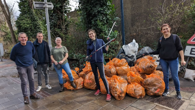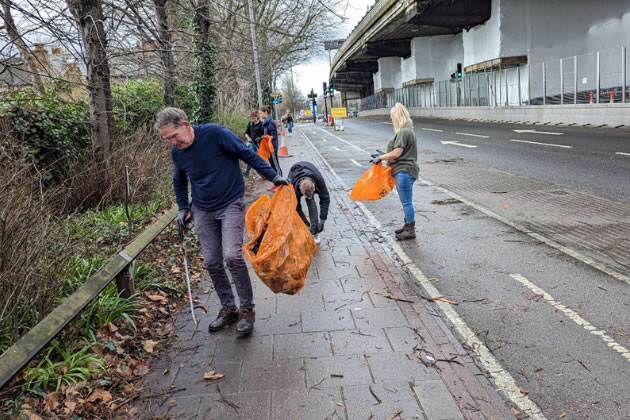 So now we were around to Saturday, and the first litter pick I had organised for a long time. I had enthusiastic support from all the other Brentford councillors and a good smattering of local people, a council officer etc. Our morning session was on the A4. The first time I did a serious litter pick was there and there’s a part of the A4 where I was sure there would be plenty to get on with It was largely hidden in the shrubs but we picked it all out – everything from sweet wrappers, bottles to a broken wash basin, lovely. I’ll forgive Marina on this occasion for straying on to the bike lane.