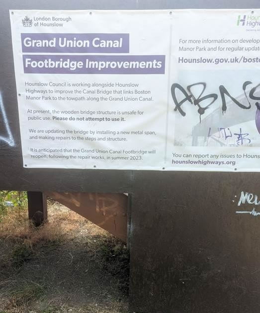 Went up to Boston Manor Park to see if there was anything visible on the new bridge which is supposed to be coming at the end of June. There wasn’t, but the park was quite busy with people sitting on benches or on the grass with picnics, and the place looking lovely. Our local answer to Banksy had ‘improved! The information notice. An affable man looked puzzled and asked me where to cross. I had various suggestions including swimming (though someone braver than me later suggested crossing the lock gates).