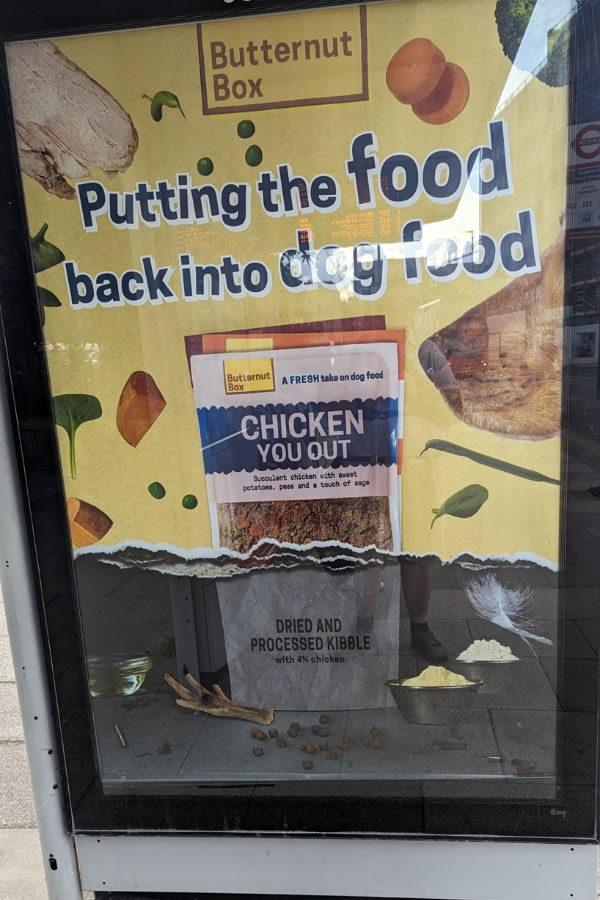 What seemed to me to be a very strange dog food advert seen on all bus stops round here. At first sight I thought the nose belonged to a rat. I am not a dog owner and hasn't been for many years but I would not be tempted to buy this concoction for my beloved pooch. I suppose I could buy it for Boris Johnson – will be handy for next time he’s in the dog house with his wife.