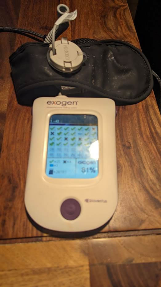 Then I was off to Charing Cross for a regular update at the Fracture Clinic. I have to drape this infernal machine over my shoulder every day for 20 minutes with some funny goo on it.