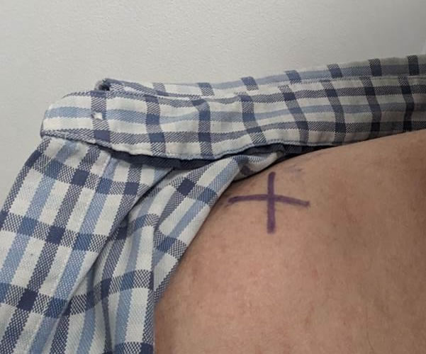 The main work of the consultant this morning was to position the target on my shoulder because it’s pretty difficult for me to do. Bernie, the bolt.