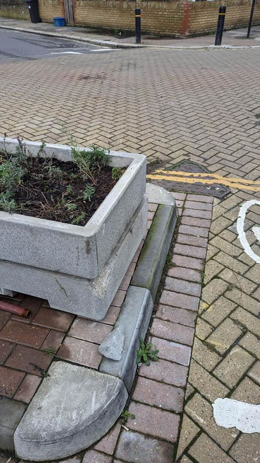 On the way home I visited Whitestile Road, where idiots keep trying to drive past the road barrage, sometimes moving them to facilitate it, and on another occasion somebody took a chunk out of the concrete (and I imagine a chunk out of his car) and then demolished one of this lovely telecom cabinets which these days grace our pavements.