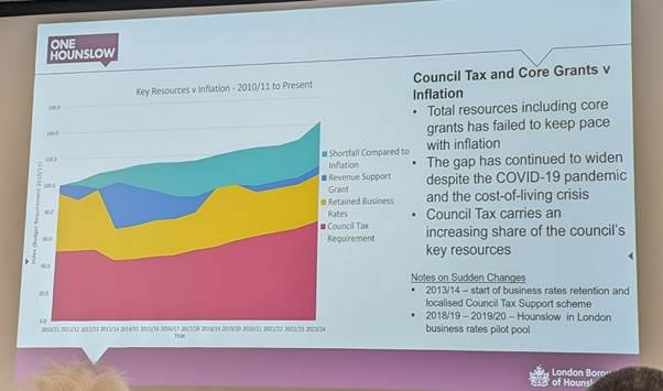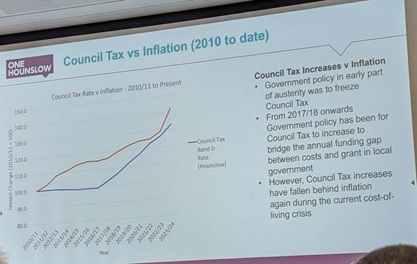 The second slide reminds us for several years council tax didn’t go up at all. We then clawed back a bit of the loss of income (though not nearly enough to deal with increasing demand) but last year with inflation out of control the gap widened again.