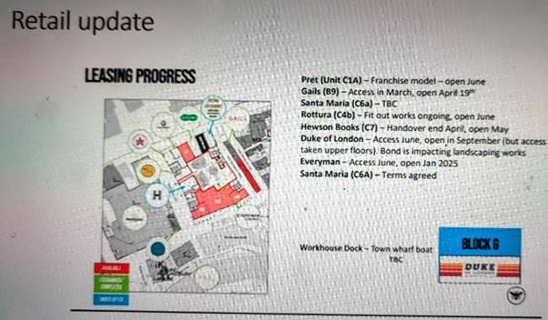 Back to listen to the update from Ballymore (not a lot of news but updates of status) – Gail’s opened today (Thursday) I hear.