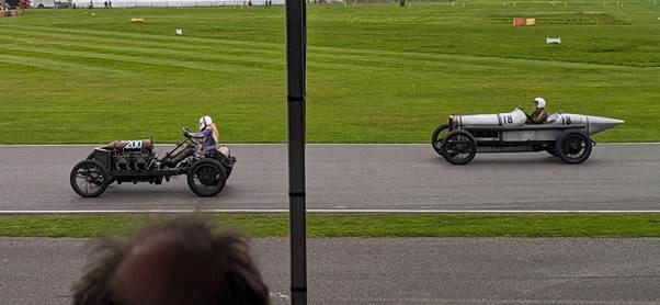 A venerable 1905 Darracq 200HP racer, with its 22.5litre V8 engine, has just overtaken the strictly modern 1916 Sunbeam Indianopolis with a meagre 4.9 litre 6 cylinder engine. To me, the amazement of these vehicles is not only their design and diversity, but that anyone is brave enough to race them. The Darracq looks like a soapbox cart but will go at 120mph.
