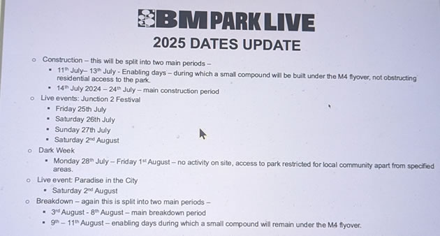 We lose access to some of the park for the best part of a month. But better news is that they have ensured we have access down the park that leads to the bridge for all of the time except when the events are actually on - 4 days in total.