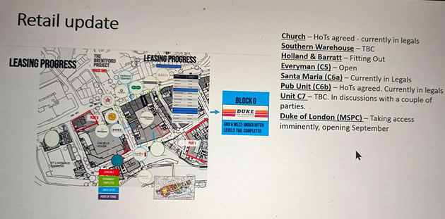 Discussions of various matters but what is closest to my heart is the development of retail. They are coy about Pret a Manger - I don't get the impression it will really happen, but as you can see there is some good possibilities for the others. The Hounslow owned site, for 11 retailers, is still mainly secret, though I see from the press (nobody thinks it's appropriate to let me know directly) that the supermarket from Albany Parade is now beginning to fit out I understand the hairdresser Bia is busy getting approval for her fit out plans, so progress painfully seems to be proceeding,