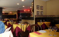 The decor inside is engaging, with the combination of yellow and burgundy table cloths providing a warm yet bright atmosphere. The walls are covered in dark wooden panelling contrasted with painted gold motifs and mosaics, items you think should clash but don't.