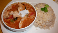 I had a Mixed Starter, with Thai spring rolls, prawns on toast, chicken wings and satay. Although the spring rolls were fairly ordinary, the toast tasted more of prawns (prawnier?) than eaten elsewhere and were more visible. The chicken wings had a tasty crunchy coating which made them more interesting to eat and the satay had a liberal helping of dip to enjoy. My guest had Tom Khan Hed, a vegetarian creamy coconut soup with mushrooms, lemon grass, galangal and lime leaves. Never having heard of galangal we asked and discovered it to be a Thair version, more or less, of ginger, with slices of it in the soup being a bit crunchy and woody, with a spicy explosion when bitten into. The lime leaves also smelt very strongly of lime and the soup had many different individual flavours to discover and enjoy.
