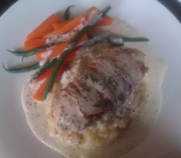 Chicken breast stuffed with black pudding, wrapped in bacon with mash, veg and a cream and white wine sauce