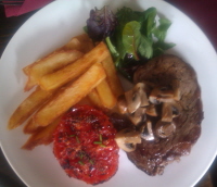 On this particular visit (I have gone through the entire menu, more than once), I had chicken breast, wrapped round black pudding, in a bacon blanket with a slightly mustardy sauce. I've never had that combination of chicken and black pudding before and it works very well. The vegetables are also crisp, cooked just right. My faithful dining companion had rib-eye steak that was lightly peppered with very crunchy chips and a properly grilled tomato.