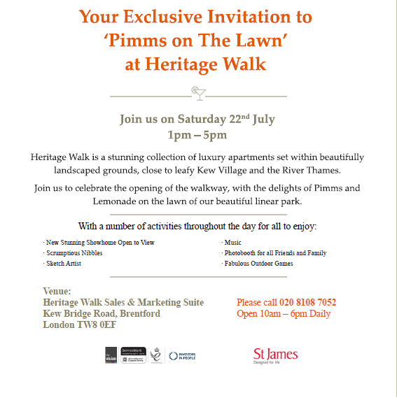 Join us to celebrate the opening of the walkway, with the delights of Pimms and Lemonade on the lawn of our beautiful linear park.