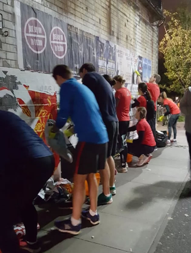 After seven months of requesting permission from TfL to be allowed to clean the area under the Turnham Green bridges where the mural is to be installed, the day finally dawned. Last Wednesday evening a team of do-gooders from the fabulous Good Gym (who run to a site, do good things for an intense and hard-working hour, and then jog on) ripped off most of the flyposting from the taxi-cab side, aided by an enthusiastic cabbie.