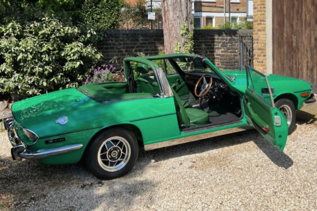 It is a java green 1977 Triumph Stag with black convertible hood and green upholstery with the registration UEK 82S.