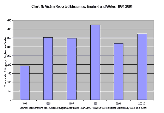 At the beginning of the decade 1990-2000 the chance of being mugged in any given year for the average member of the adult population was around one in two hundred. By the end of the decade that risk had doubled (i.e. became one in a hundred).