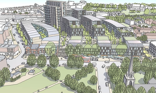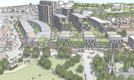 Aerial view from over Turnham Green looking across at development on site of Sainsbury's car park from the plans revealed in 2012
