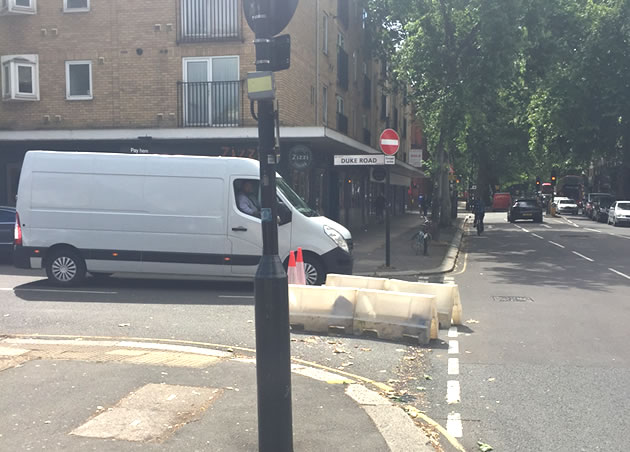 Barriers prevent entry into Duke Road from Chiswick High Road