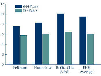 The effects of the quality of the air can be seen in asthma levels locally. The table opposite is from a study by the Ealing, Hammersmith and Hounslow Health Authority which shows our area being well above other parts of the Health Authority for cases of asthma particularly for children. The report suggests that asthma may not necessarily be caused by air pollution and that smoking is a major extra factor but, as the study points out, smoking tends to be inversely related to income level. If this is accurate then more affluent Chiswick would have a lower incidence of smoking strongly suggesting that the high asthma levels locally are to do with traffic pollution. |