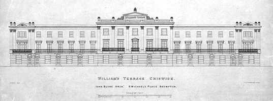 John Blore lived all his life in Brompton, South Kensington, where he built many properties. He completed his architectural training aged 25 and built William's Terrace the following year. The print was probably intended to promote this speculative development. Blore's design increases the formal grandeur of the building by omitting the rooflines and chimneys. If this had been a commission, he would not have needed the printed copies of the design since his client would have had access to the original drawings.