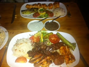 The chicken was plentiful, succulent and tender. It was served with a mound of white rice, mixed with a little brown rice for texture, a salad garnish, tomato and pickles. The mixed platter was a carnivore’s delight, an enormous mound of meat, each giving a different flavour and texture. The lamb was moist and tender, the kofte delicately spiced. A green chilli sauce and a yoghurt and mint sauce were also served alongside.