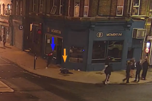 Jerald Netto (yellow arrow) after the push by the youth (blue arrow) that killed him. Picture: Met Police