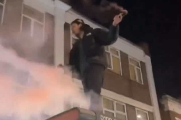 A man climbs on a bus stop in Southall with a flare. Picture: @UB1UB2
