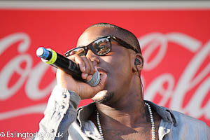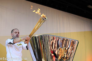 Loick Essien (above) rocked the park As the torch was carried on stage by Tom Thacker, 30, from Southall, and as the flame was transferred to the gold cauldron a massive cheer erupted filling Walpole Park.