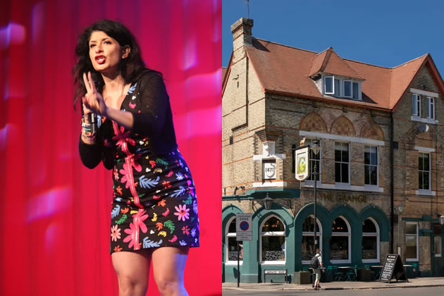Left: Shappi Khorsandi. Right: The Grange. Picture: Rodw/Facebook