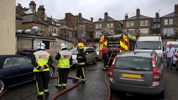Four fire engines and 21 firefighters were called to a blaze at a bakery with flats above in Leeland Road in West Ealing yesterday ( 4th September).