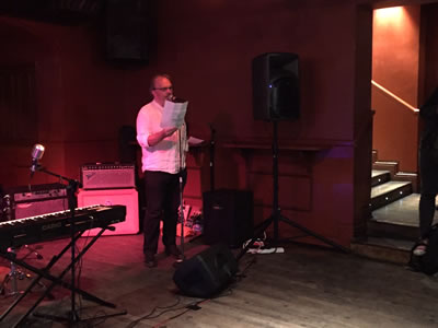Speeches concluded, piano-based blues singer Marky Dawson opened with a jaunty, high-octane set on the keyboard performing his own music including, “Bad Girl”, “Whatever the Weather” and his own version of “Hit the Road Jack”. Dawson is short, almost childlike in stature, with a thick froth of blonde curls reaching his shoulders, and although just one man, he plays with the energy of four, each with tabasco sauce coursing in their veins. Dawson maintained this lethal voltage for over twenty minutes, pausing for a sip of beer and a joke, before another bolt, pounding the keys with fingers that danced and smashing the high notes like a hammer. At one point, Dawson executed a trumpet riff using his mouth which made the bar staff stop serving, and then, he was out of his seat playing one-handed at rapid patter, while drinking, sitting on the floor and turning around – he is a true showman and entertainer at heart. He said: “I always wanted to be like Jerry Lee Lewis.”