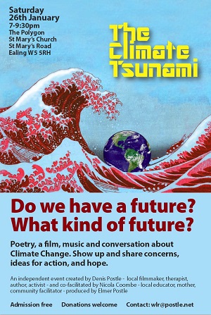The Climate Tsunami is a family event, Denis Postle is a veteran film-maker, author, activist, and therapist - Nicola Coombe is a local educator, mother, facilitator and teacher with an international reputation, Elmer Postle producer, is a local Craniosacral Therapy practitioner, educator and video producer.