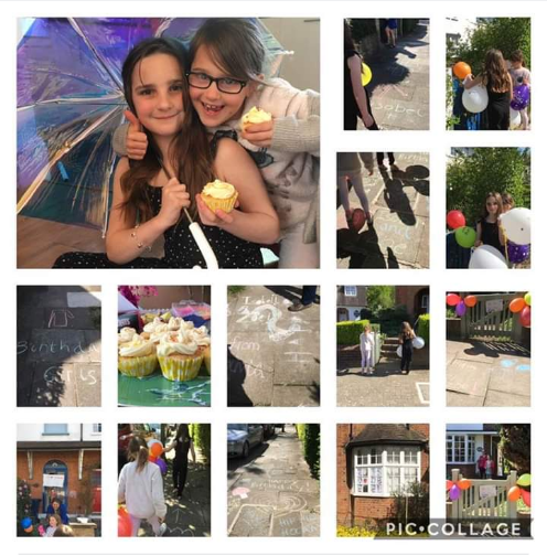 ''To make them feel connected, special and give them joy - on Tuesday neighbours and local school friends put out balloons, made signs, drew in chalk on pavements, left out gifts (or in one case lowed a gift from a make shift rope of dog leads and ribbons from a top floor flat) and waved from windows or doorsteps as we did our once-a-day exercise of a local walk. Some readers may have seen two little girls with a massive bunch of balloons walking the streets. We were all overwhelmed."