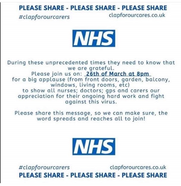 On Thursday 26 March at 8pm everyone is being urged to #clapforourcarers.